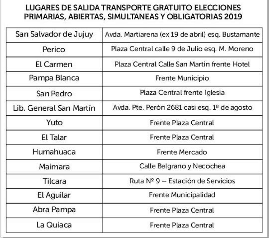 En este sentido, el Gobierno de la provincia, garantiza la gratuidad del servicio de transporte, tanto la ida como la vuelta para la emisión del sufragio, previa acreditación mediante el Documento Nacional de Identidad, el cual acredite la locación donde debe cumplir con su obligación cívica.