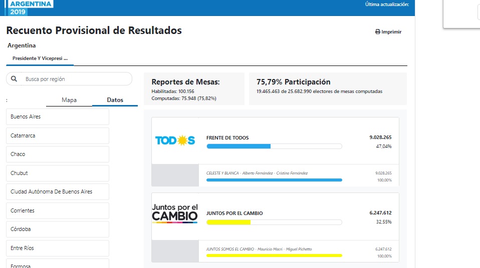 Los primeros números arrojaron una participación del 75,54% (en línea con lo sucedido en las PASO de 2015) y con el 58,62% de las mesas escrutadas (58.716 sobre 100.156), Alberto Fernández alcanzaba el 47,01% de los votos y Mauricio Macri el 32,66%.