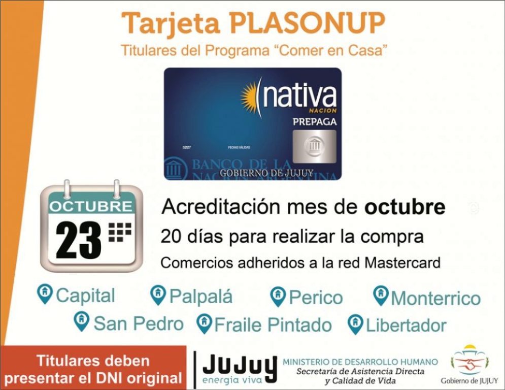El Ministerio de Desarrollo Humano, a través de la Secretaría de Asistencia Directa y Calidad de Vida, comunica que hoy miércoles 23 se acreditó la Tarjeta PLASONUP, correspondiente al corriente mes de octubre, para que todas las personas titulares del Programa Comer en Casa, de las 7 localidades donde se implementó, puedan realizar la compra de alimentos.