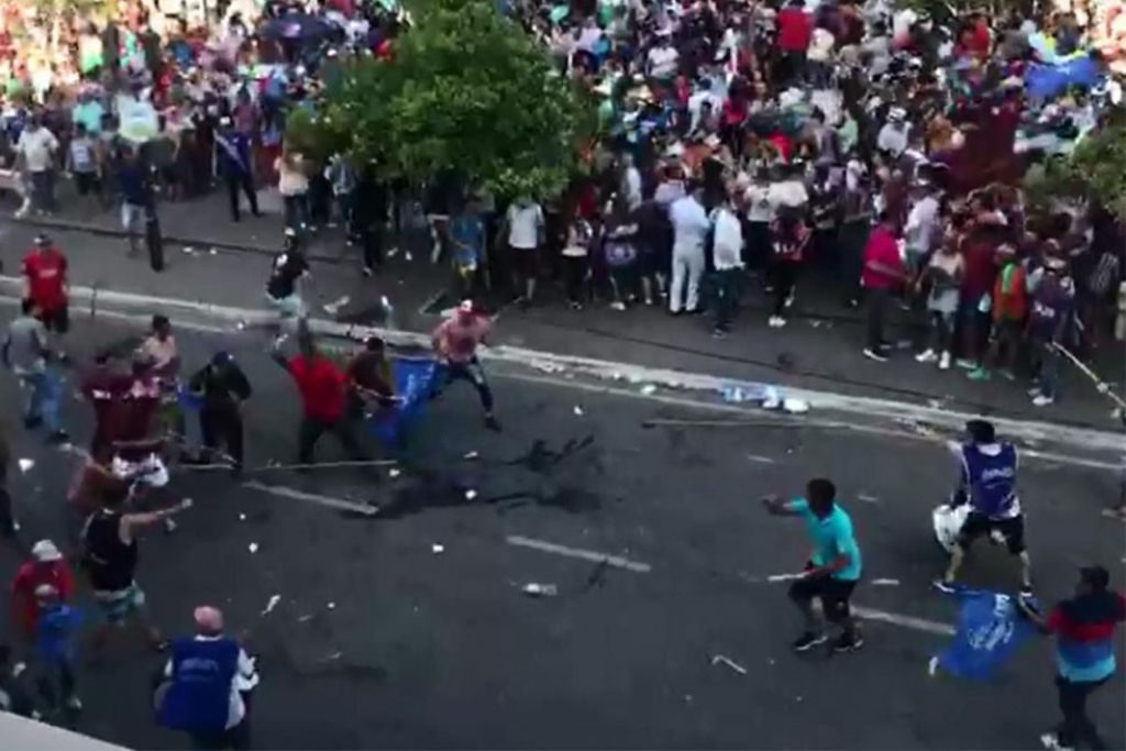 Con los palos de las banderas como lanzas, piedras y trompadas, dos sectores quedaron registrados en una pelea que se viralizó rápidamente en las redes sociales. Según informó La Gaceta de Tucumán, uno de los grupos portaba chalecos azules con el nombre de Cacho Cortalezzi, ex presidente del Concejo Deliberante capitalino. Se enfrentaron contra militantes de la Uocra, aunque también habrían participado otras facciones del peronismo local.