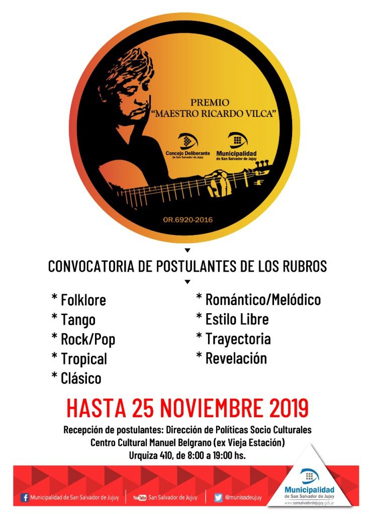 Las postulaciones o inscripciones se realizarán en oficinas de la Política Socio Culturales sita en el Centro Cultural “Manuel Belgrano” de avenida Urquiza desde las 8 hasta las 19 hs. hasta el lunes 25 de noviembre. Para conocer las bases y condiciones podrán dirigirse a: http://sansalvadordejujuy.gob.ar/premiosvilca