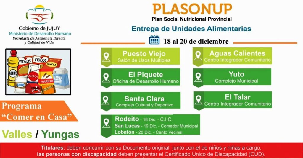 El Ministerio de Desarrollo Humano, a través de la Secretaría de Asistencia Directa y Calidad de Vida, comunicó que desde hoy miércoles 18 hasta el viernes 20 de diciembre, se realizará la entrega de Unidades Alimentarias del programa “Comer en Casa” del Plan Social Nutricional Provincial, en localidades de estas dos regiones.