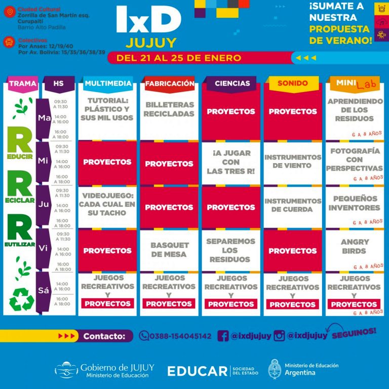 La propuesta de vacaciones de verano incluyen actividades relacionadas a las “Tramas” (con diferentes ejes temáticos), Experimentos, Triple R (Reducir, Reciclar, Reutilizar), Cine, Robótica, Videojuegos, Arte Sonoro y Carnaval. Las mismas se propondrán desde nuestros laboratorios de Ciencias, Sonido, Fabricación Digital y Multimedia, durante las semanas de enero y febrero.
