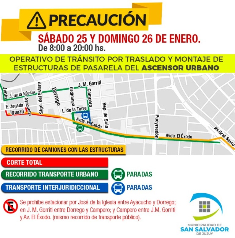La Dirección de Transito y Transporte, dependiente de la Secretaría de Servicios Públicos de la Municipalidad de San Salvador de Jujuy, informa a la población en general y a los usuarios en particular, que mañana -sábado 25 de enero- a partir de las 8, se trasladarán estructuras metálicas destinadas al armado de la pasarela del ascensor urbano desde la ciudad de Palpalá hacia nuestra ciudad (intersección de calles Iguazú y Santiago del Estero). Se destaca que tanto el sábado como el domingo procederán al montaje de las mismas.