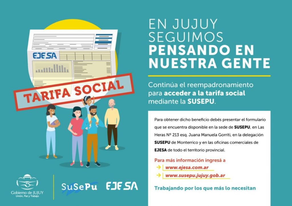 Se recuerda a quienes cumplen con los requisitos para ser beneficiarios y aun no se reempadronaron quedando fuera de la Tarifa social que, deberán presentarse de inmediato a las oficinas de la Su.Se.Pu. o sus delegaciones en el interior, como así también, en las oficinas de EJE SA, donde pueden retirar el formulario y requisitos.