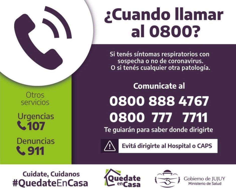 La principal normativa es que aquella persona que necesite del sistema de salud, ya sea para una consulta o para recibir atención, se comunique al teléfono 0800-888-4767 o bien al 0800-777-7711. Cabe recordar que el SAME 107 funcionará para la urgencia y que, para realizar denuncias de personas que no esten cumpliendo con la cuarentena funcionará el 911.