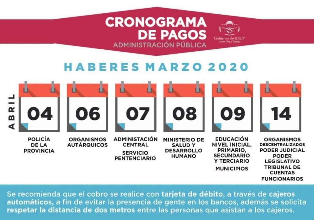 Tesorería de la Provincia anunció el cronograma de pagos de haberes netos para los empleados de la administración pública provincial y municipal por el período correspondiente a marzo de 2020, que iniciará el sábado 04 de abril. Se recomienda que el cobro se realice con tarjeta de débito, a través de cajeros automáticos, a fin de evitar la presencia de gente en los bancos, además se solicita respetar la distancia de dos metros entre las personas que asistan a los cajeros.
