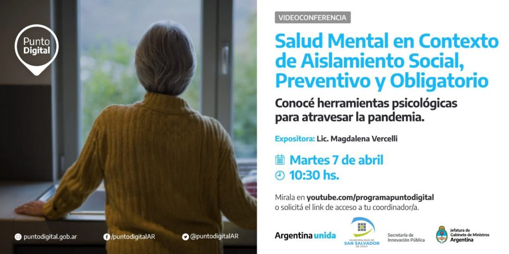 Esta actividad totalmente gratuita está destinada al público en general y tiene por objetivo brindar herramientas psicológicas para enfrentar el actual aislamiento social preventivo y obligatorio debido a la pandemia de Covid 19 y estará a cargo de la Licenciada en psicología Magdalena Vercelli el día martes 7 de abril a partir de las 10:30 hs.