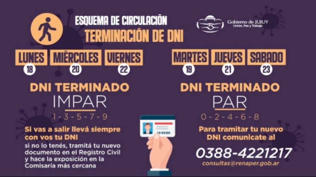 Los días martes 19, jueves 21 y sábado 23, podrán circular las personas con DNI par y terminación 0.