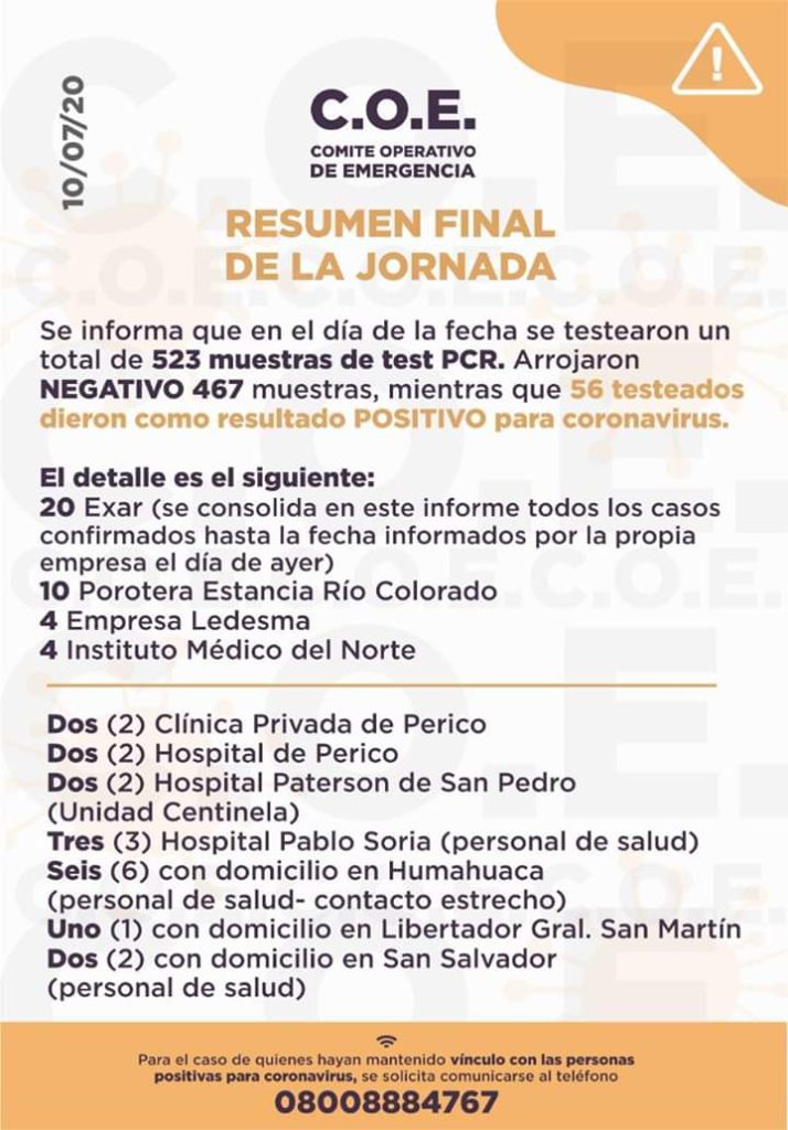 Además, las autoridades del COE emitieron otro informe en donde se detallan los casos positivos en la porotera Estancia Río Colorado de Pampa Blanca y en Minera Exar. En la primera hubo 10 contagios, 9 de Pampa Blanca y uno de El Carmen. En Exar, 21 personas no viven en la provincia y 20 son jujeños – 8 en San Salvador, 2 en Susques, 2 en Palpalá, 2 en Catua, 1 a San Pedro, 1 en El Carmen, 1 en Abra Pampa, 1 en El Aguilar, 1 en Pampa Blanca y 1 en Tilcara.