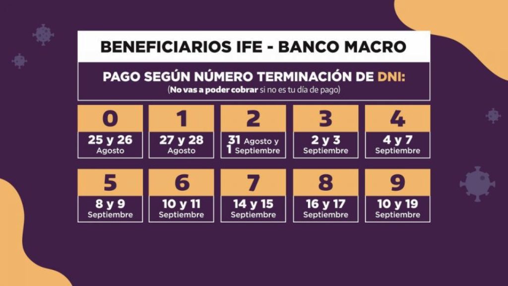 El Gobierno de la Provincia informa que los beneficiarios del Ingreso Familiar de Emergencia (IFE) comenzarán a cobrar sus respectivos montos en las sucursales del Banco Macro, siempre de acuerdo a la terminación del DNI, a partir del día 25 de agosto.