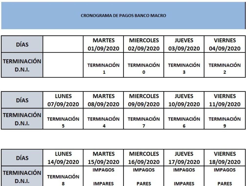 La misma metodología se determina para la próxima semana, iniciando el lunes los DNI concluidos en 5, miércoles los DNI finalizados en 7 y el viernes lo harán los terminados en 9; de similar forma abonarán el día martes los DNI concluidos en 4 y el jueves los terminados en 6, concluyendo el día lunes 14 los DNI terminados en 8.
