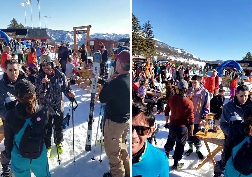 Sin barbijo ni respeto por el distanciamiento social y rodeados de sol, nieve y cerveza. Una hermosa postal en una tarde soleada en San Martín de los Andes. La imagen no llamaría la atención, si no hubieran sido grabadas en medio de la emergencia sanitaria por el coronavirus. El video fue grabado hace unos días en la base del cerro Chapelco. Los protagonistas son un grupo de esquiadores que no respetan el protocolo de prevención del covid-19.