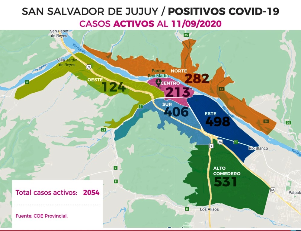 A la fecha son 2054 los casos positivos activos de Covid-19, distribuidos de la siguiente manera: 282 en el distrito norte; 406 en el sur; 498 casos en el este; 124 en el oeste, 213 en el centro y 531 corresponden al distrito Alto Comedero.