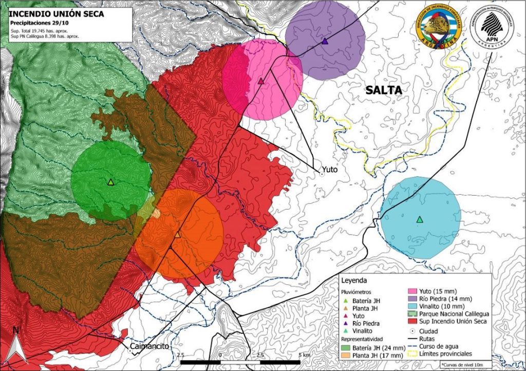 Respecto a los incendios en El Bananal y el que se produjo en el cerro “El Hermoso”, el Ministerio de Ambiente de Jujuy reporta que ambos fueron contenidos, llegando a afectar una superficie de 130 has el primero y 460 has, el segundo. Un incendio contenido es aquel que por el momento detuvo su avance y está circunscripto, debido a que resultaron las tareas desarrolladas por los equipos, o porque alcanzaron sitios o lugares que le impiden continuar. Si bien están identificados los bordes de los mismos, no hay seguridad de que no puedan volver a avanzar o “saltar”, por eso se los monitorea hasta el momento en que se logra controlar y extinguir.
