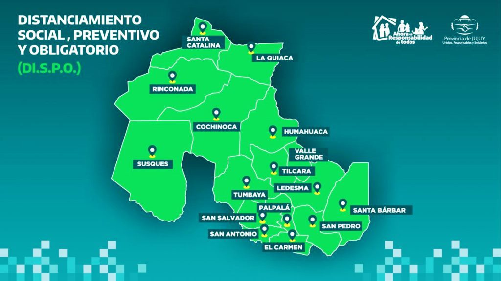 En atención a que Jujuy registra sólo transmisión viral por conglomerados reducidos, dejando atrás la situación de circulación comunitaria, toda la provincia califica como zona verde, manteniendo las medidas de bioseguridad contempladas en la etapa de Distanciamiento Social, Preventivo y Obligatorio (DISPO). En caso de registrarse eventual rebrote, se volverá a condición amarilla o roja en el lugar que sea necesario y de acuerdo a las condiciones epidemiológicas y sanitarias.
