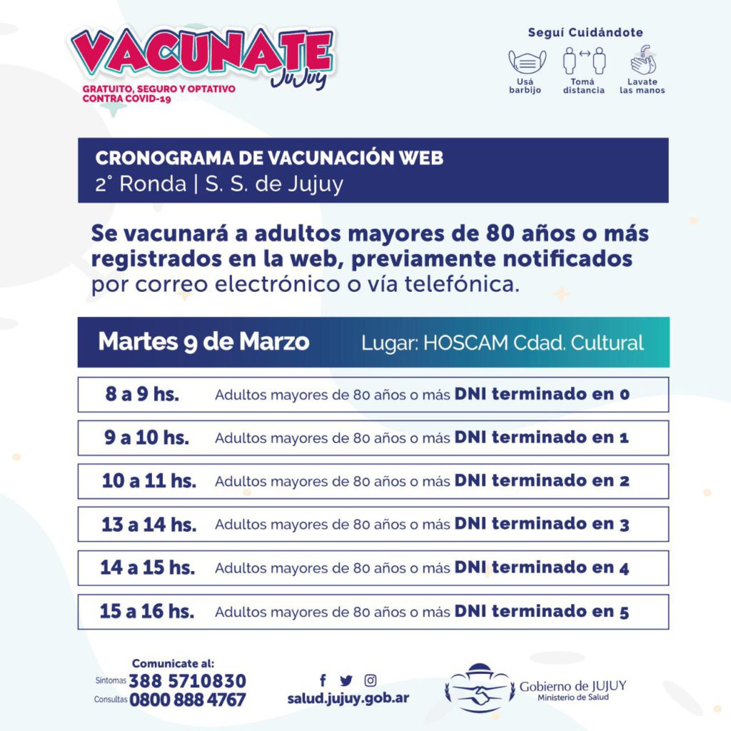 Inició este martes la segunda ronda de vacunación para adultos mayores que se hayan registrado vía web con dirección en San Salvador de Jujuy, así informó el Ministerio de Salud de la provincia.