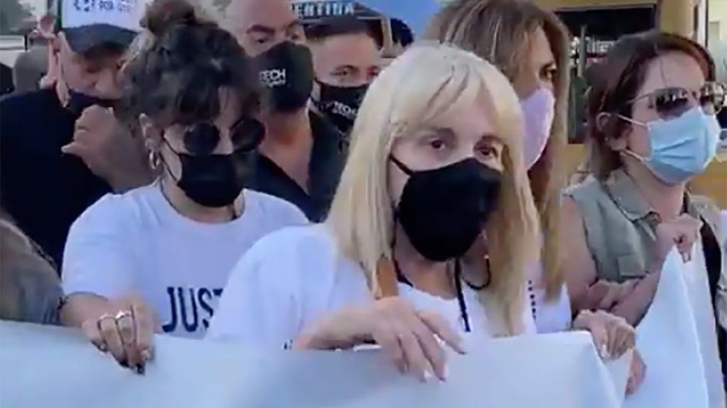 A las 17:57 de este miércoles 10 de marzo la concentración registró el momento más esperado cuando la exesposa de Diego y sus hijas Dalma y Gianinna aparecieron en escena con una bandera con la inscripción: “Condena social y judicial a los culpables”.
