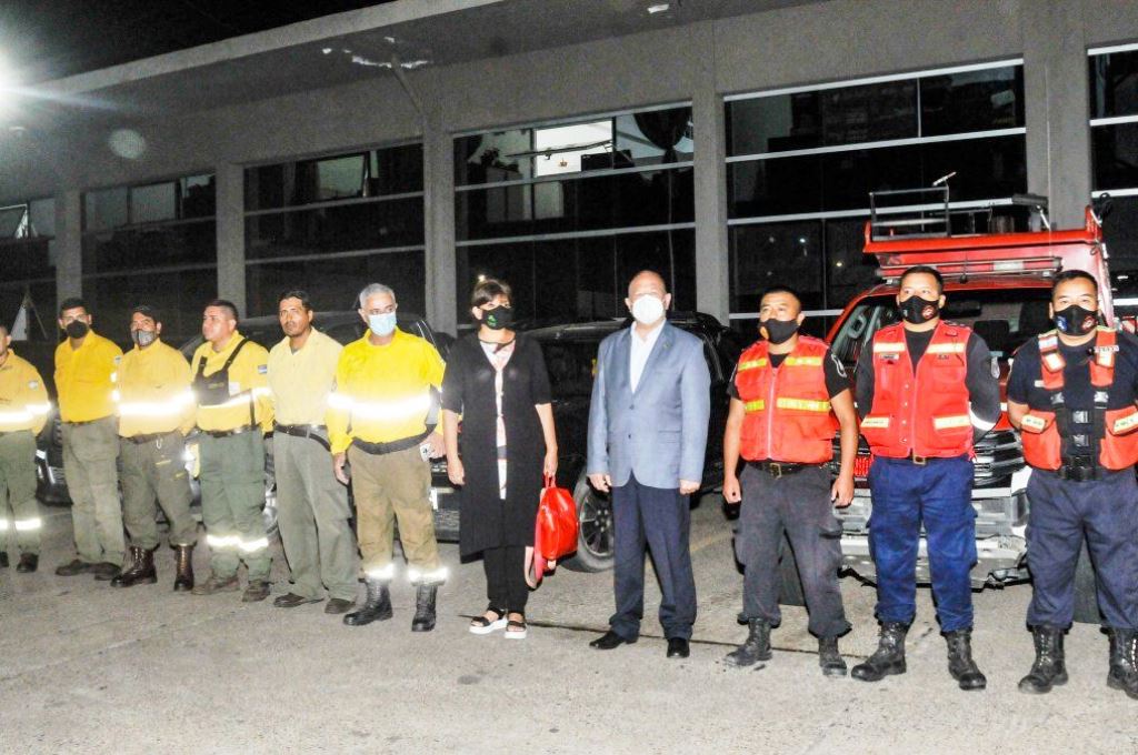 Los ministros de Ambiente y Cambio Climático, María Inés Zigarán y de Seguridad, Luis Martin, despidieron las cuadrillas en la madrugada de este domingo 20 de febrero en un acto realizado en la Central de Policía. Con esta dotación también se envió un importante aporte de la empresa de agua de mesa jujeña Xuma que aportó fardos de botellas para atender las necesidades de los trabajadores que están combatiendo los fuegos de vegetación en Corrientes.