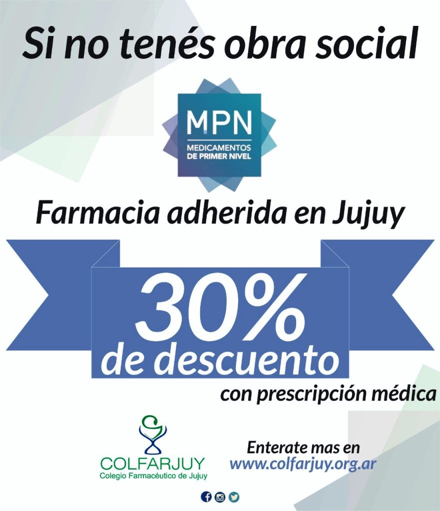 A partir de junio, 55 farmacias de la provincia de Jujuy se encuentran incluidas en el convenio MPN -Medicamentos de Primer Nivel-, que busca ayudar a personas que no cuenten con obra social y será sólo para medicamentos de origen nacional de primer nivel, bajo prescripción médica. Esta es una iniciativa conjunta entre el Colegio Farmacéutico de Jujuy, laboratorios farmacéuticos nacionales y las farmacias de Jujuy.