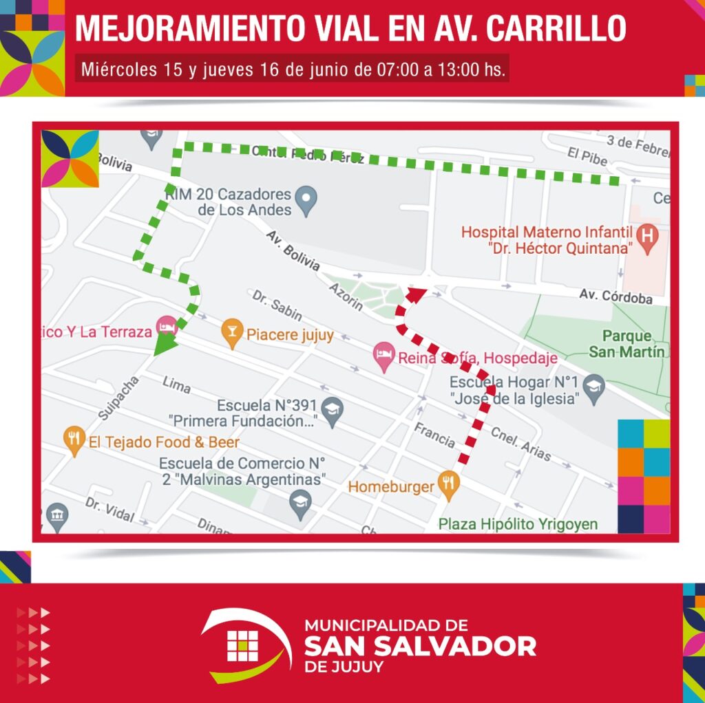 La Dirección de Tránsito y Transporte, dependiente de la Secretaría de Servicios Públicos, informó a la población en general, y a los vecinos del barrio Ciudad de Nieva, cambios en el tránsito a causa de las obras de mejoramiento en avda. Carrillo en el acceso al mencionado barrio.