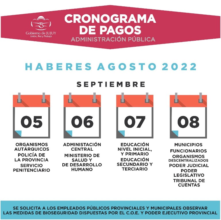 Finalmente, el 8 de septiembre, cobrarán los trabajadores de municipios, funcionarios, Organismos Descentralizados, los poderes Judiciales y Legislativo y Tribunal de Cuentas.