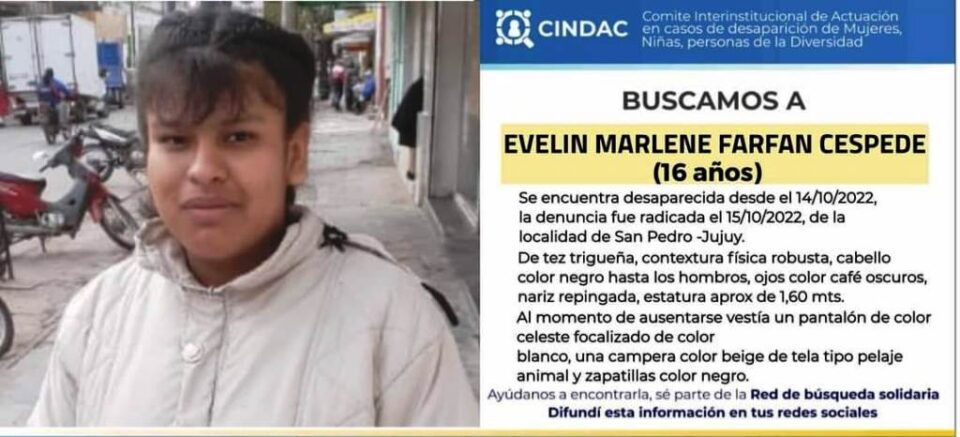 Desde el Ministerio Público de la Acusación (MPA) informó el hallazgo del cuerpo de una joven en Libertador Gral. San Martín y que conforme las descripciones de los familiares, la vestimenta y los registros fílmicos de las cámaras de seguridad, sería el de la menor Evelin Marlene Farfán.