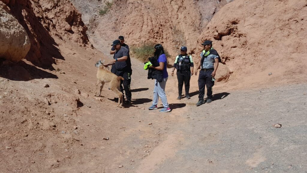 Personal de la Policía Turística rescató un guanaco que deambulaba por la zona del cerro de Siete Colores en la ciudad de Purmamarca.