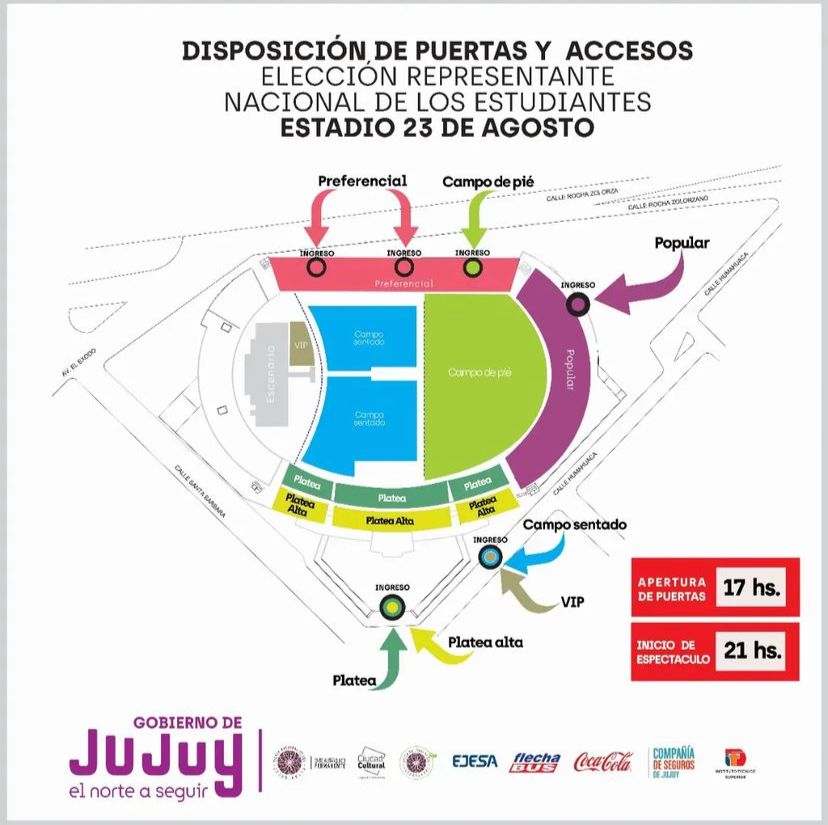 El Ente Autárquico de la Fiesta Nacional de los Estudiantes, dio a conocer la disposición de ingreso del público al Estadio “23 de Agosto” del Club Gimnasia y Esgrima, para el día viernes 29 de septiembre en el marco de la Elección de la Reina Nacional y el espectáculo previsto. El Ente señaló que las puertas del estadio se abrirán a horas 17, mientras que el espectáculo dará inicio a horas 21.