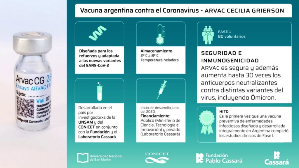 La vacuna ARVAC Cecilia Grierson, desarrollada por la Universidad Nacional de San Martín, el CONICET y el Laboratorio Cassará, e impulsado desde el primer momento por la cartera de Ciencia, Tecnología e Innovación y la Agencia Nacional de Promoción de la Investigación, el Desarrollo Tecnológico y la Innovación (Agencia I+D+i), demostró ser segura y eficaz como refuerzo contra el virus SARS-CoV-2 en mayores de 18 años.