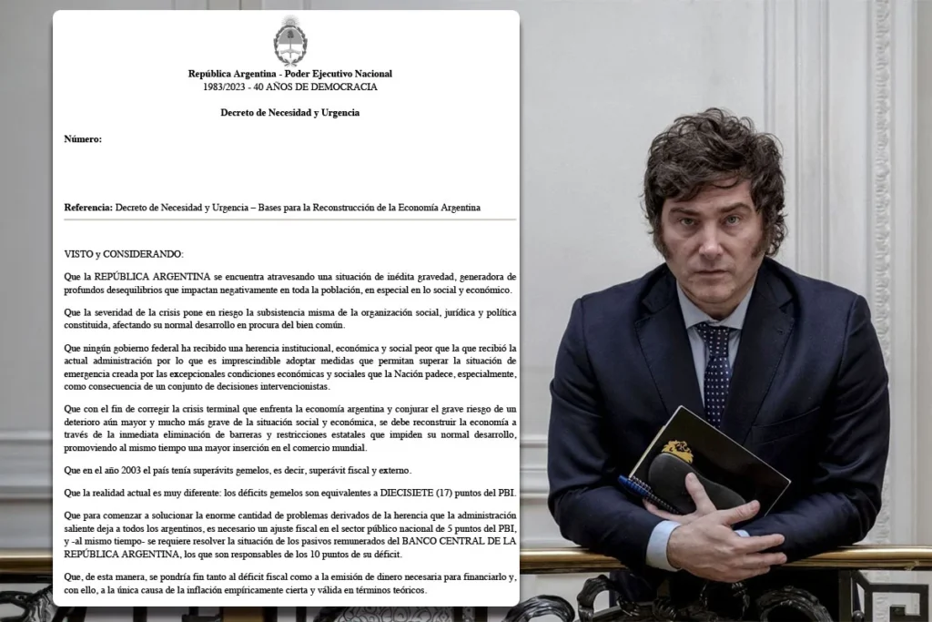 Javier Milei tomó la primera gran medida de su Gobierno al firmar un decreto de necesidad y urgencia (DNU) para desregular la economía. La norma deroga 41 leyes, DNU y decretos por completo y deroga artículos de otras tantas con el objetivo de “sentar las bases para la reconstrucción de la economía argentina”.