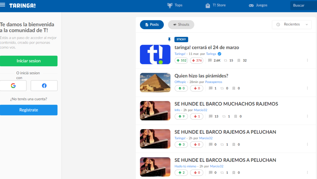 La red social argentina Taringa!, de mucha popularidad a comienzos del siglo XX, anunció que cerrará de manera definitiva el próximo domingo 24 de marzo del 2024. Considerada como una de las comunidades virtuales más grandes en idioma español, la noticia generó una fuerte repercusión.