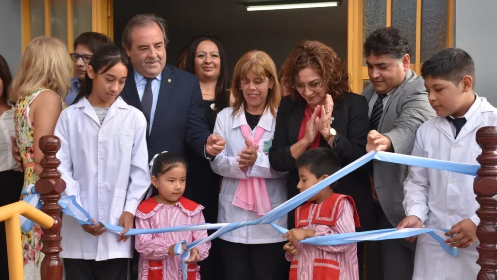 El vicegobernador Alberto Bernis, la ministra Miriam Serrano y el intendente Luciano Moreira encabezaron el acto que comenzó con el corte de cintas y el descubrimiento de una placa recordatoria junto a la presidente de la Comisión de Educación de la Legislatura, María Ferrín, y la directora del establecimiento, Claudia Dolsán.