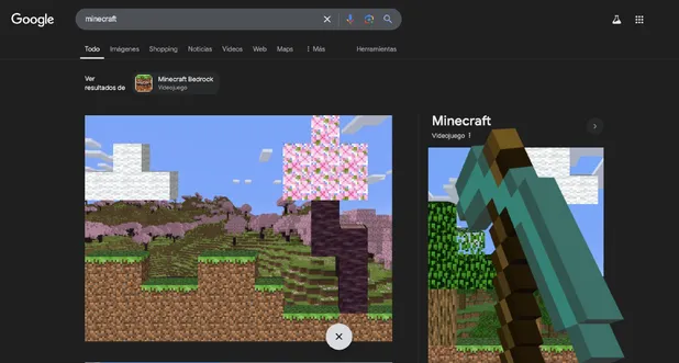 Ahora, Google ha utilizado la gran fama que ha tenido el título para añadir un pequeño simulador dentro de su propio navegador; para esto es importante que solo se busque la palabra Minecraft en el apartado de ‘búsqueda’ y el navegador enviará a diferentes resultados del juego.