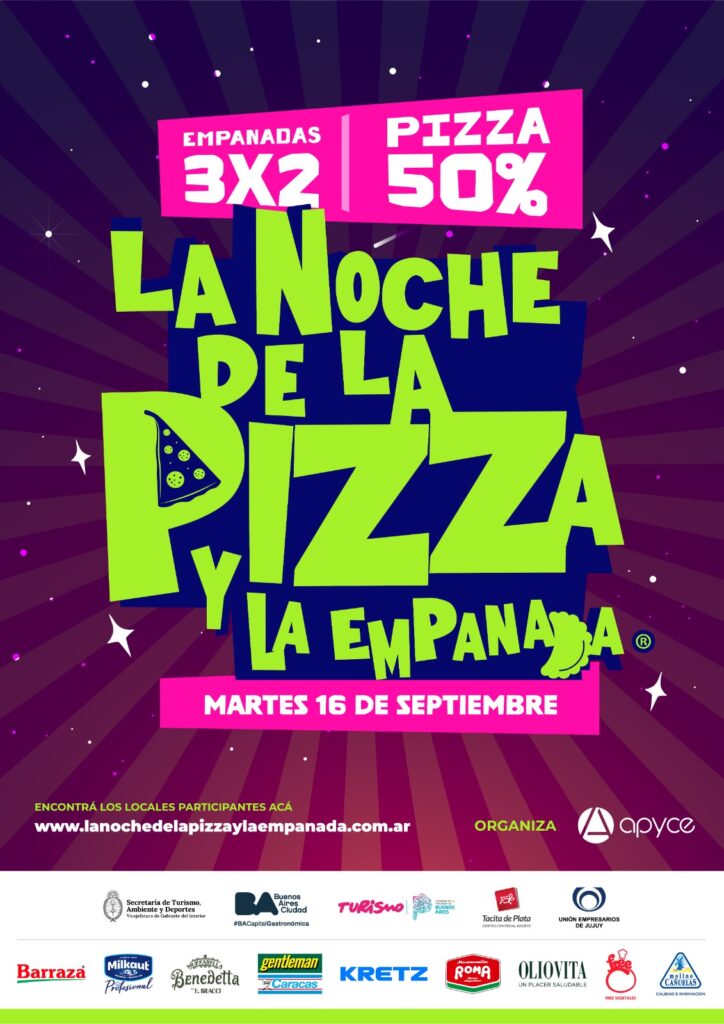 El día martes 16 de septiembre APYCE, con el apoyo local de la Unión Empresarios de Jujuy, realizará en todo el país la 42ª edición de “La Noche de la Pizza y la Empanada”, una jornada declarada de Interés Turístico Nacional que convoca a miles de consumidores y comercios de la gastronomía argentina.