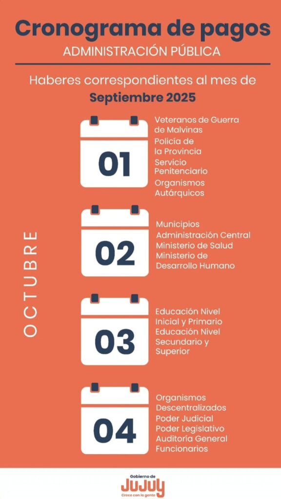 Por último, el sábado 4 de octubre, se les efectivizará sus haberes a Organismos Descentralizados, Poder Judicial, Poder Legislativo, Auditoria General y Funcionarios.