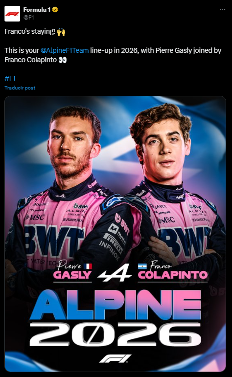 Estoy muy agradecido a Flavio (Briatore) y a todo el equipo por confiar en mí. Ha sido un camino largo y difícil, y estoy muy orgulloso de la oportunidad de volver a correr con este equipo en 2026, junto a Pierre, quien ha sido un gran compañero y sin duda alguien de quien seguiré aprendiendo”, expresó el argentino en sus primeras palabras tras la comunicación.