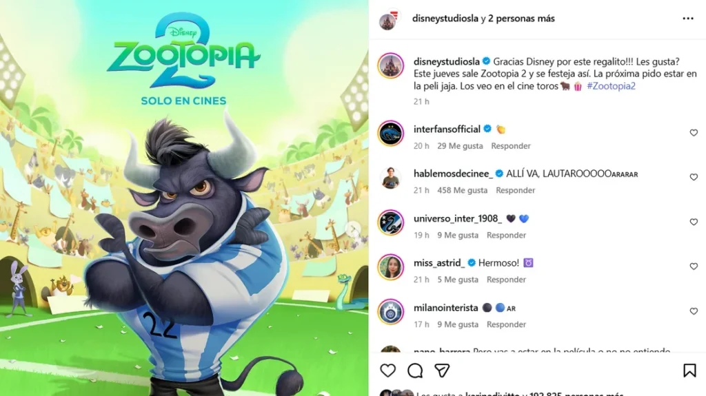 “Gracias Disney por este regalito!!! Les gusta? Este jueves sale Zootopia 2 y se festeja así. La próxima pido estar en la peli jaja. Los veo en el cine toros #Zootopia2”, escribió Martínez en su cuenta de Instagram.