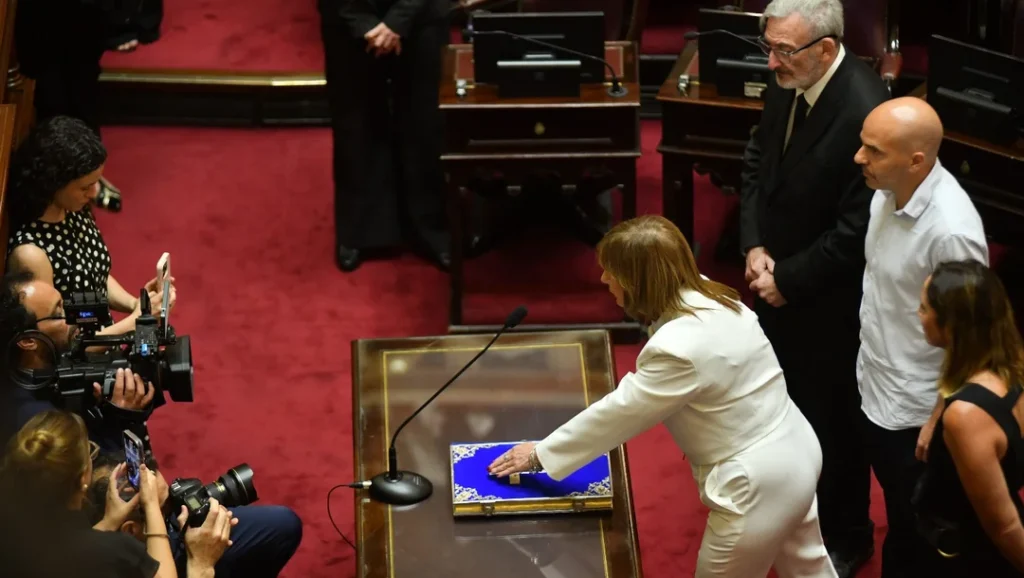 De los 24 senadores electos el 26 de octubre pasado, prestaron juramento 23. La razón radica en que la senadora electa por la minoría de Río Negro, la libertaria Lorena Villaverde, no tenía asegurado el aval para refrendar en la votación del hemiciclo su diploma.