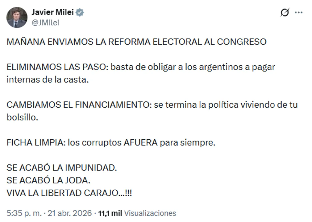 El presidente Javier Milei anunció que este miércoles enviará al Congreso un proyecto de reforma electoral que incluye la eliminación de las PASO, cambios en el financiamiento de la política y la implementación de Ficha Limpia para impedir candidaturas de personas condenadas por corrupción.