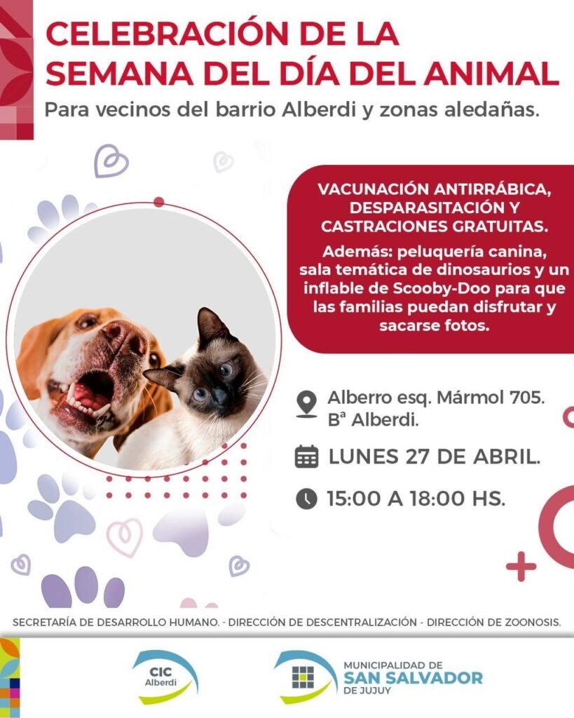 En el marco de la Semana del Día del Animal, la Municipalidad de San Salvador de Jujuy invitó a los vecinos a participar de una jornada especial que se llevará a cabo el próximo lunes 27 de abril, de 15 a 18 horas, en el CIC Alberdi.